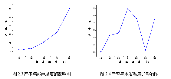 在超声加热的条件下,硫酸钙晶须的产率是随超声温度的升高而升高。在水浴加热的条件下,硫酸钙晶须的产率在70~80℃出现峰值,结合超声加热法制备硫酸钙晶须的结论可知,在温度为70~80℃时,可以制得高产率硫酸钙晶须。