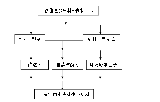 项目将以水泥为胶结材料,以纳米TiO和碳化氮为自清洁材料,在一定条件下制备出生态新材料I型;以改性沥青为核心材料,以纳米TiO和碳化氮为自清洁材料,在一定条件下制备出生态新材料II型,分别研究I和II型自清洁雨水快渗生态材料的相关特性,具体技术如下: