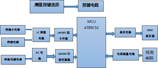 本设计中系统分四大部分:测量电路、控制电路、通道选择和显示电路,取得相应的振荡频率,然后根据所测频率判断是否转换量程,或者是把数据进行处理后,得出相应的参数值。
