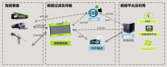 本项目设备支持实体企业湖南中联重科智能技术有限公司(中联智能)作为长沙智能制造示范企业,已通过移动互联网、云计算、大数据、物联网等与智能装备制造行业的结合来推进智能制造产业,促进企业转型升级。以物联网作为有效手段来形成层次更丰富的信息系统,将人与人、物与物、人与物实现全面连接。目前,中联智能已开展物联网云平台建设工作,通过智能装备行业几十万台数据的连接,以及海量连接后的数据分析,从而为行业提供新的业务价值,为长沙智能制造推进发展起到示范作用。中联智能现有设备应用框架图和智能物联网框架图,如图2所示。