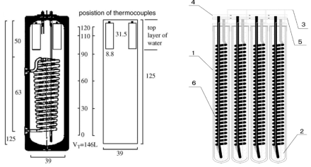 图 2 热水器换热结构(a 相变水箱盘状螺旋换热结构;b 储热式无水箱太阳能热水器结构图;注:1-太阳能能真空管;2-储热材料;3-电加热器;4-进水管;5-出水管;6-换热器。)