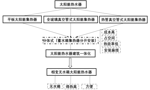 分体式太阳能热水器与一体化相变太阳能热水器均能实现与建筑的完美结合,但分体式成本较高、热利用效率较低。因此,本项目拟采用本项目组已开发的高效太阳能储热材料(专利申请号:201510996234.X,发明人:李传常,杨立新,陈荐)以及初步制作的试验无水箱太阳能热水器样机的基础上,通过现场试验数据采集分析、相变材料与集热管道匹配优化设计、集热管及连接管道匹配优化设计等手段,制作一台出水温度稳定、热水供量充足等性能优良且安装方便无水箱太阳能热水器。