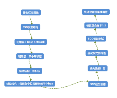 2)识别交通标志。依靠图像处理和模式识别技术,将图像信息转化为数字信息与已知的交通标识模式对照以辨别出具体交通标志种类,确保车辆在无人驾驶过程中在不违反交通规则的前提下行驶或停止。具体依靠SSD模型结构对图像初始层上添加逐渐减小的卷积层以便进行多尺度预测,之后的每一个新添加的层,可以使用一系列的卷积核进行预测,在每个位置上预测出一个相应的值,即相对其他box的偏移量,这里的box就是在特征图中各处预测的若干个box,基本完成后再进行训练和测试。