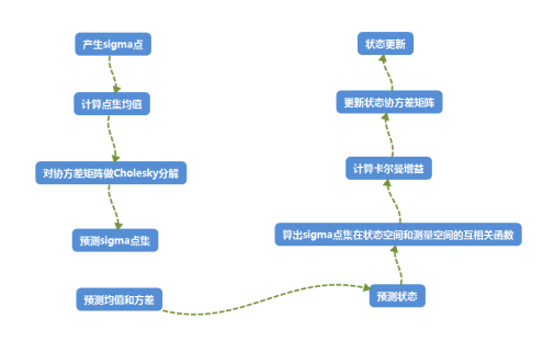 1)预测和更新车辆位置。通过无损卡尔曼滤波器,在已测得实时车辆速度的条件下,预测下一帧图像中车辆的位置并实时更新,保证车辆能够平稳地行驶或停止。首先需要产生sigma点集并计算其均值,后写出对估计状态的不确定性即协方差矩阵,之后通过公式与矩阵变换预测sigma点集和其均值与方差,最后完整地按照卡尔曼滤波的更新步骤计算即可,完整流程如图20
