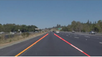 1)识别车道线和汽车前置车道边界。依靠图像处理和深度学习技术,将每一帧的图像进行反向透视,确定车道线位置与走向,再利用卷积神经网络(CNN)完成对车道线的特征提取和分类,最后将不同情况即遮挡,阴影,逆光,图像质量,路况,道路问题都不同的数据加入训练集进行训练,保证车辆在不会越过边界的前提下安全稳定地行驶。车道线检测和汽车前置车道边界处理如下图所示。