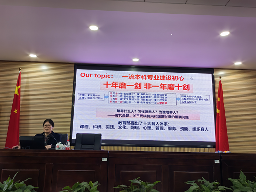 刘晓明教授讲授的主题为“同心同向同行 一流专业建设 三全五育英才”。她从河北工业大学建设一流本科专业建设点的经验谈起,从专业定位、专业建设、专业特色、师资队伍、教学质量、人才培养等方面详细介绍了专业建设总体思路、举措与成效。在专业建设中,她提出了“坚持三全五育英才,科研反哺教学,创新改革并举”的总体思路,强调了贯彻立德树人根本任务,坚持工学并举办学特色的责任与担当。紧接着,刘教授从学校之责,顶层设计、学院之责,一院一策、专业之责,一专一品、教师之责,一课一优、学生之责,五育四有等方面诠释如何同心同向做实专业建设。结合电气工程专业,刘教授就交叉学科融合下一流本科专业建设点的新需求与新挑战提出了解决思路与路径。在讲座中,她结合自己作为一名专业教师的成长娓娓道来,生动诠释了专业建设中的“立德树人 教书育人 教学相长 一直在路上”,其孜孜不倦与诲人不倦的敬业精神也感动了在场的老师。最后,就专业建设过程的诸多困惑,刘教授与在场专业老师展开了交流与讨论,为学院一流本科专业建设进一步指明了方向。
