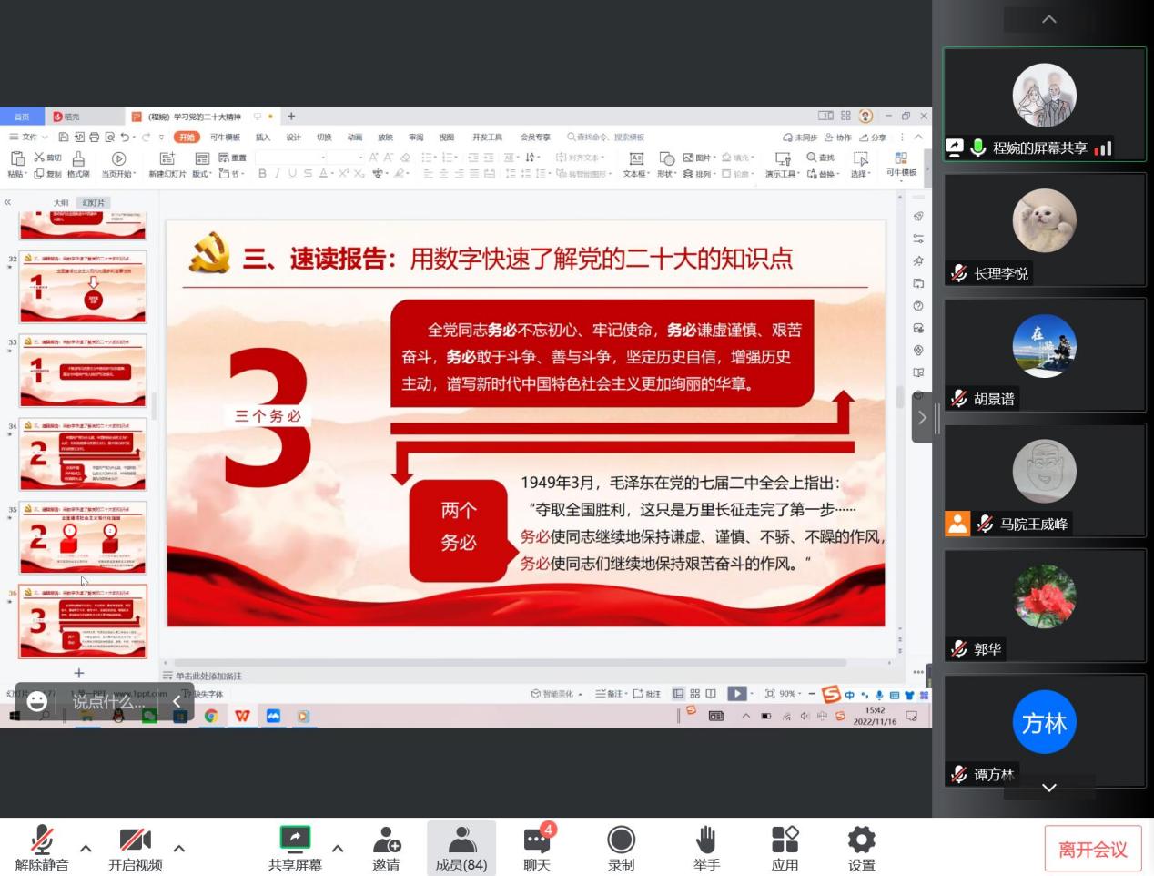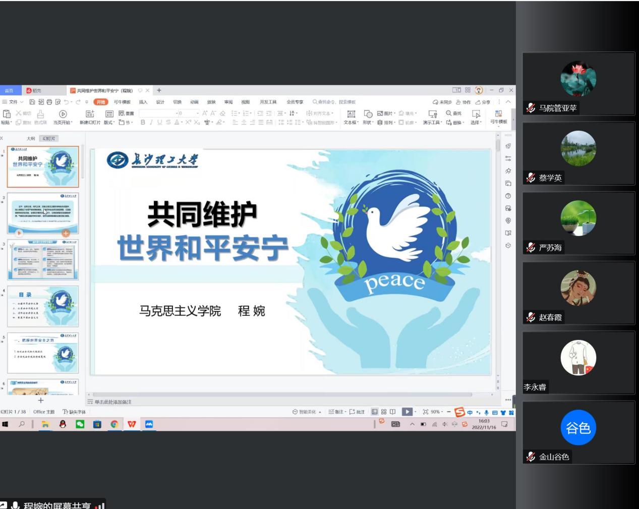 随后马克思主义学院程婉博士在集体备课环节围绕本学期《形势与政策》国际、国内专题进行讲解,国内专题主要从6个部分展开,分别为奋斗历程:从党的一大到十九大历次情况回顾;继往开来:处于关键历史关口的一次重要大会;速读报告:用数字快速了解党的二十大的知识点;伟大变革:过去五年工作情况和新时代十年成就;明确任务:以中国式现代化全面推进中华民族伟大复兴;发出号召:为全面建设社会主义现代化国家而团结奋斗。国际专题主要从4个部分展开,分别为把握世界安全之势、认清安全问题之因、消弭安全赤字之策、彰显中国担当之行。