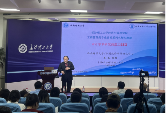 4月14日下午,中国政府审计研究中心主任、西南财经大学二级教授、博士生导师蔡春受邀为经管学院工商管理类专业前沿系列名师专题课开讲,报告主题为“审计学术研究前沿之ESG”。报告会由经管学院副院长王治教授主持,城南学院院长赵华教授出席,校内师生200余人参加。