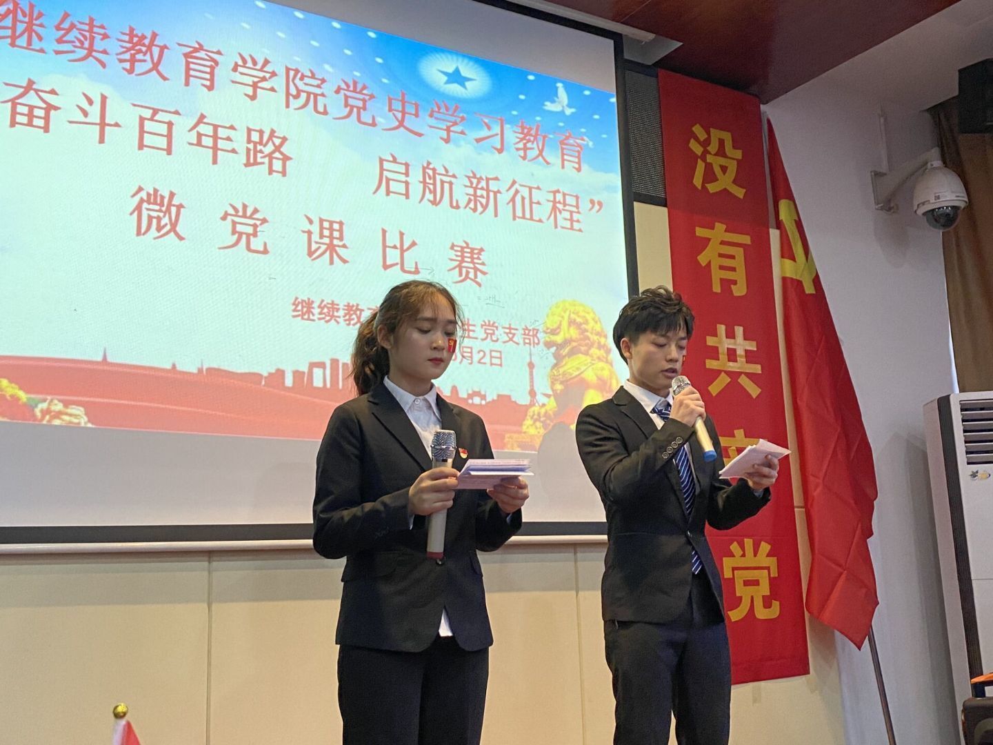 6月2日晚,继续教育学院学生党支部举办“奋斗百年路 启航新征程”主题微党课比赛。学院党总支副书记兼副院长方碧波,学生党支部书记、学工部主任刘卓明,学工部全体教师、各校企合作部负责人和学生代表参加活动。