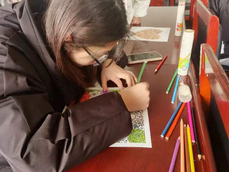 首先,指导老师文峥带领学生们进行了“正念观呼吸”的练习,让大家从纷扰的世界中尽量放松下来,专注当下,觉察自己,并请学生们带着这样的状态进入曼陀罗绘画。随后,文峥老师讲解了曼陀罗绘画的起源及应用方法,学生们挑选了自己喜欢的模板进行了涂色。 最后,同学们互相分享了作品的深层含义,以及活动中的感受。