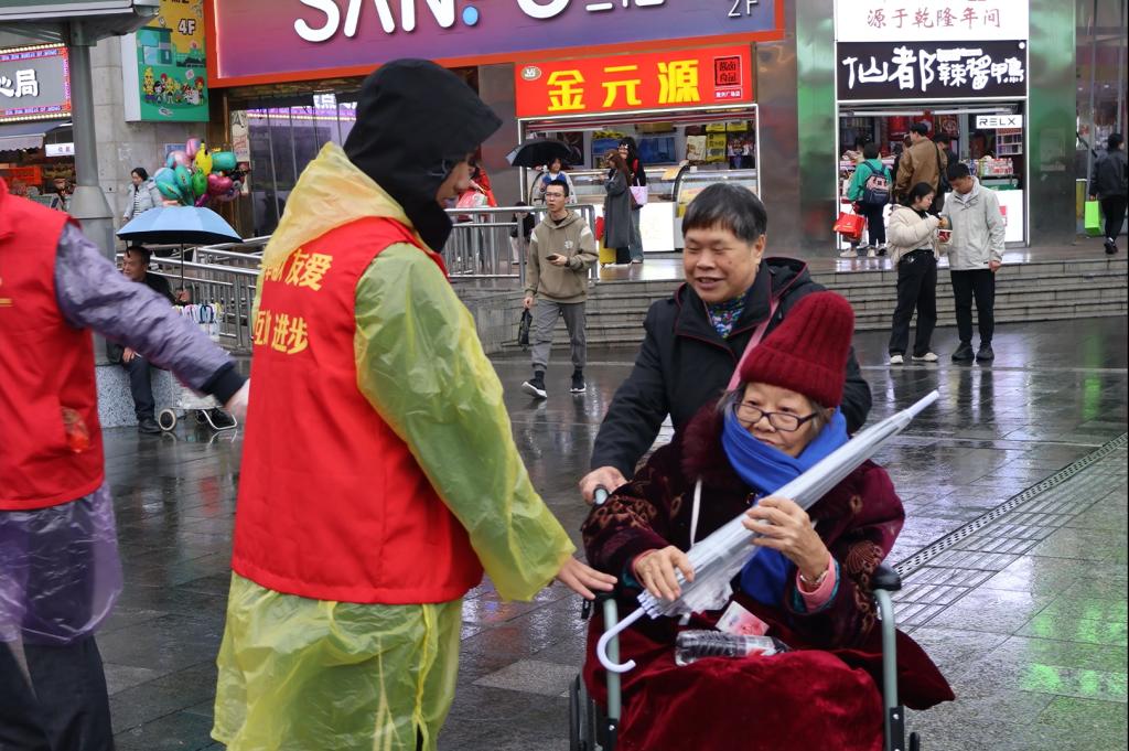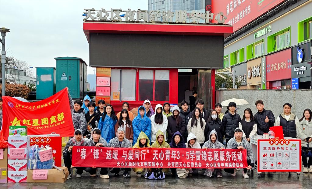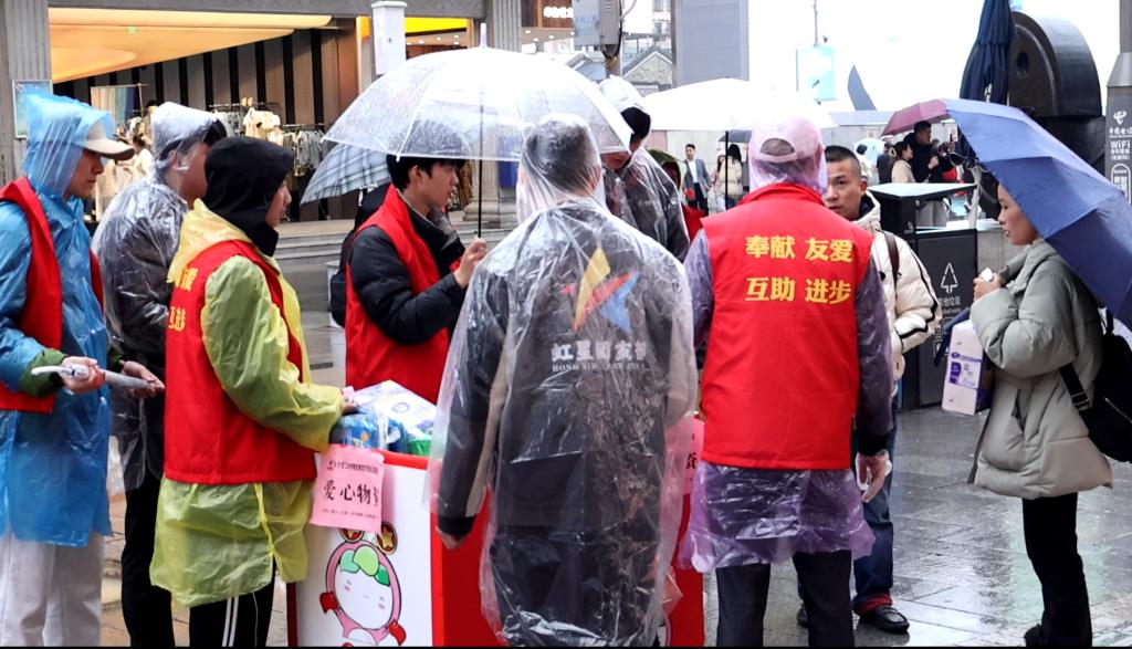 在活动现场,虹星团支部成员怀着当代大学生的热情与爱心,推着捐赠雨具、纸巾、暖宝宝等物质的爱心小推车,穿梭在黄兴广场的各个地方。哪里需要帮助,哪里就有志愿者们“爱心小推车”的身影。他们成为黄兴广场最亮丽的一道风景线。