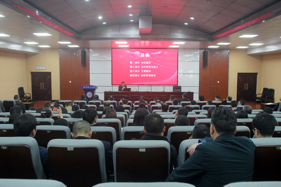 4月21日,副校长谈传生在金盆岭校区四教报告厅,为城南、继教、投资公司、校友中心教职工宣讲学校第四次党代会精神。