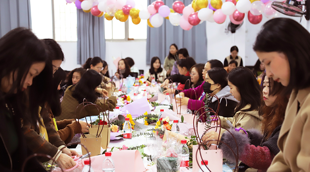 在活动现场,精心挑选和布置的花卉、精美海报、色彩丰富的气球装饰以及琳琅满目的茶点摆放,处处体现出学院党政领导对女教职工的关怀尊重和学院工会的周到考虑。专业的花艺师担任现场活动指导,演示了插花的基本技巧、花材的选择搭配,并深入讲解了如何设计插花作品的整体布局。女教职工们也在活动中学习了插花的知识,并在花艺师的精心指导下亲手体验了插花的乐趣,各自创造出富有个人特色的插花艺术作品。会场里,人与花相映成趣,分外美丽,大家纷纷与自己的作品拍照合影,留住这一美好难忘时刻,场面十分温馨。