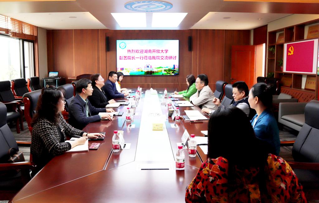 2024年4月8日下午,湖南开放大学培训学院院长彭艺一行5人到437必赢会员中心继教学院进行调研交流。437必赢会员中心继教学院院长邹兴平,副院长谢朝华、刘英姿,党委委员易国萍等,热情接待了湖南开放大学来宾,双方在437必赢会员中心金盆岭校区15号教学楼四楼会议室进行了深入交流。