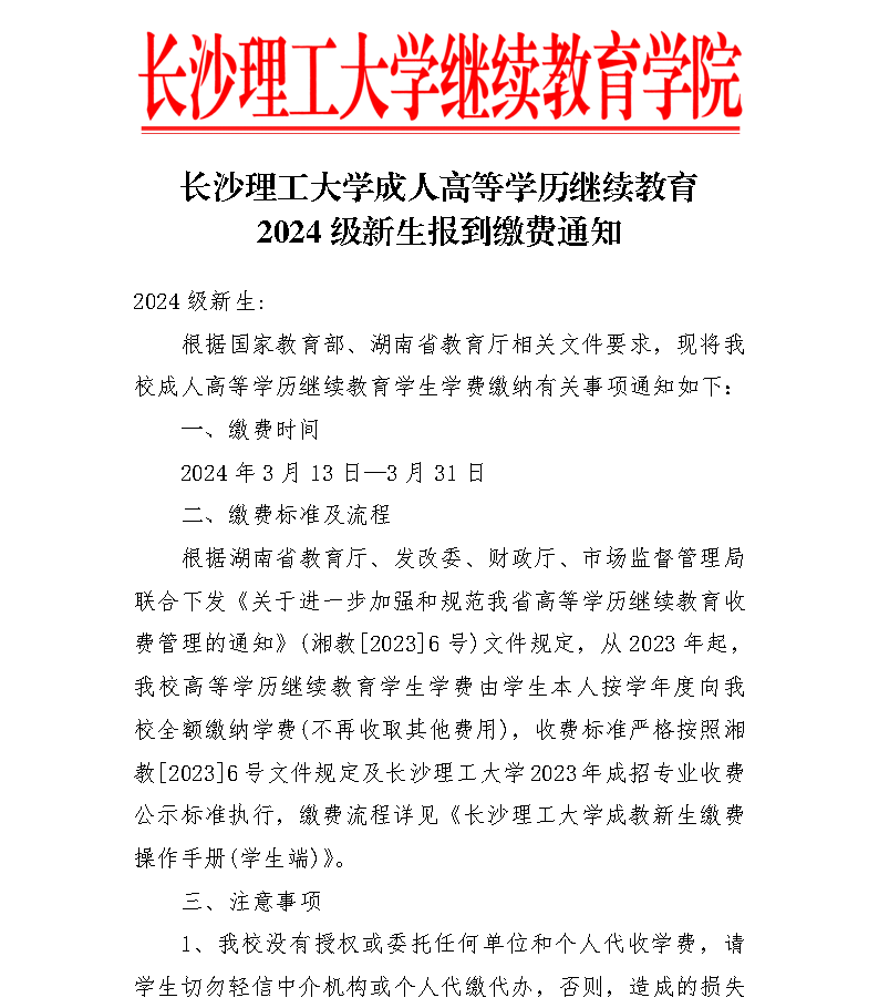 437必赢会员中心成人高等学历继续教育2024级新生报到缴费通知