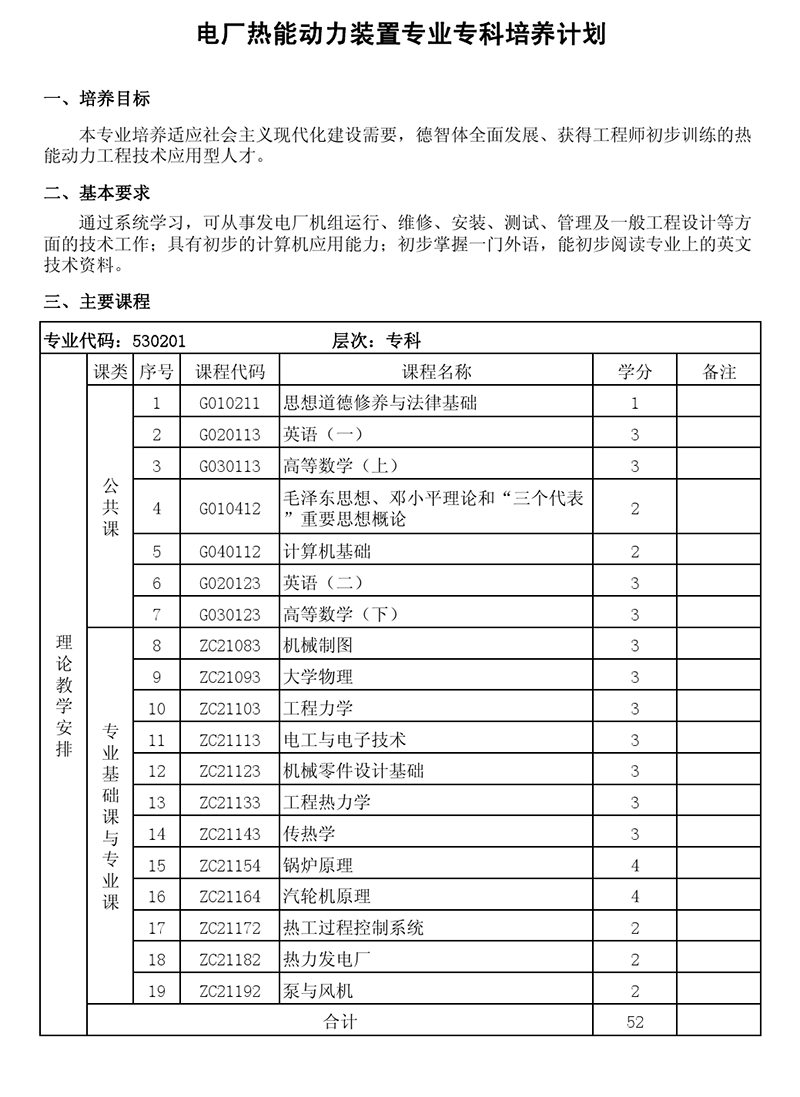 专科培养计划-专业代码:530201 电厂热能动力装置专业