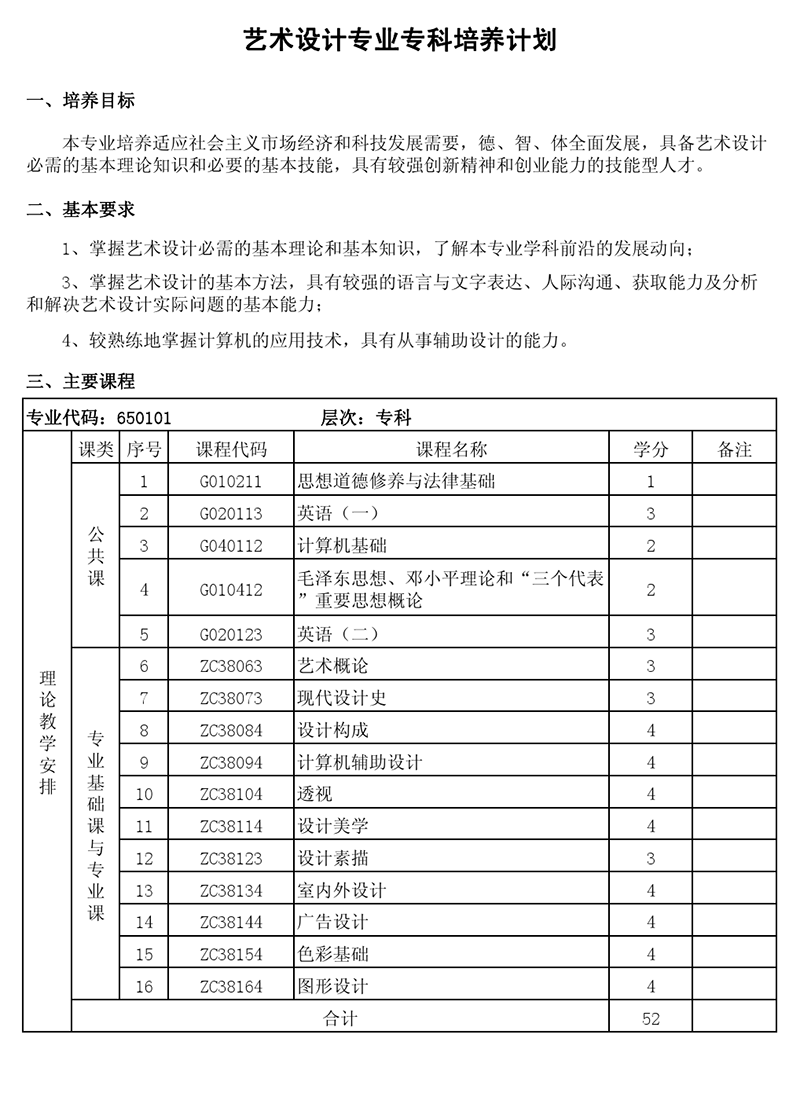 专科培养计划-专业代码:650101 艺术设计专业
