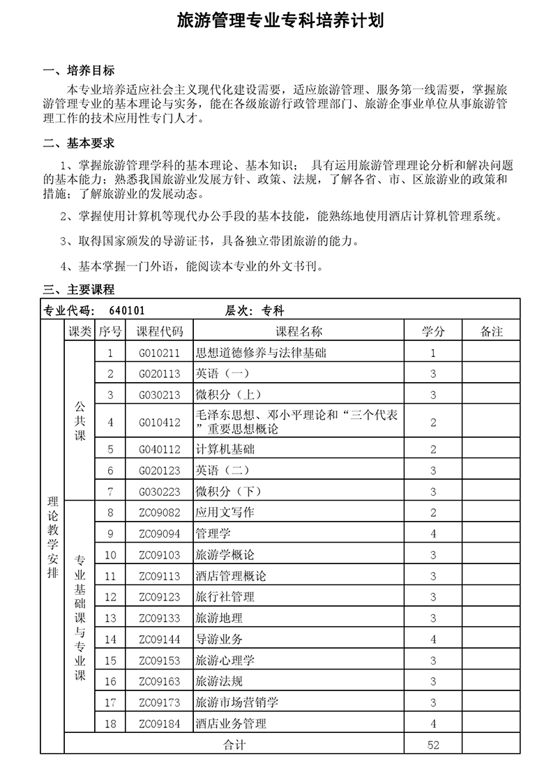 专科培养计划-专业代码:640101 旅游管理专业