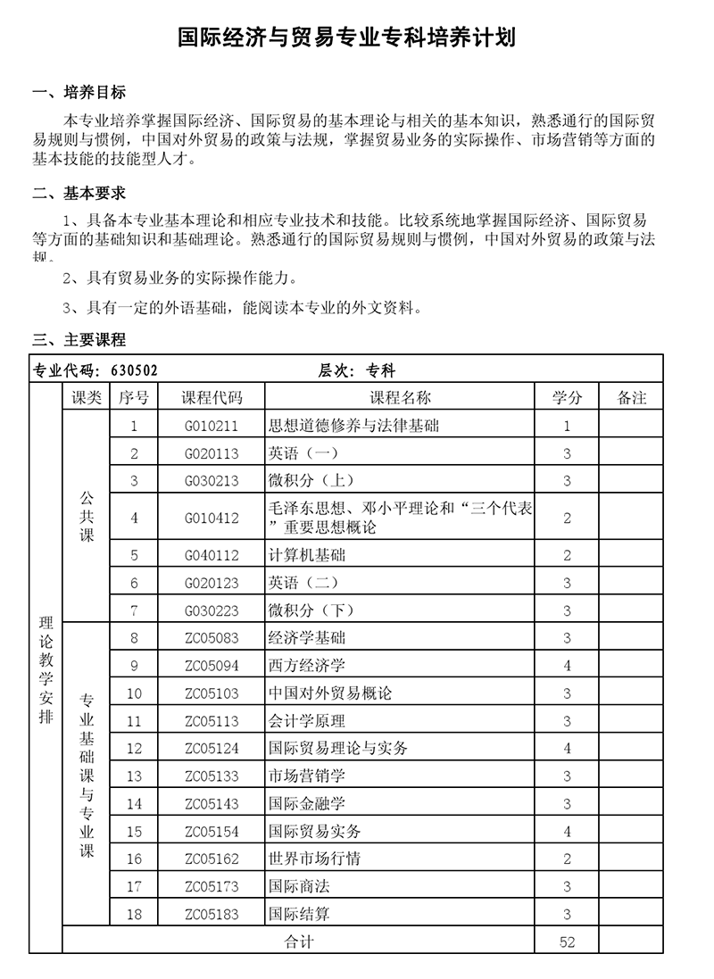 专科培养计划-专业代码:630502 国际经济与贸易专业