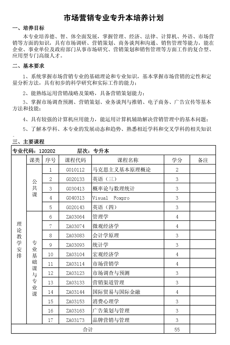 本科培养计划-专业代码:120202市场营销专业