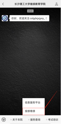 1.关注微信公众号“437必赢会员中心继续教育学院”,点击“服务查询-报修维修”,如下图所示。