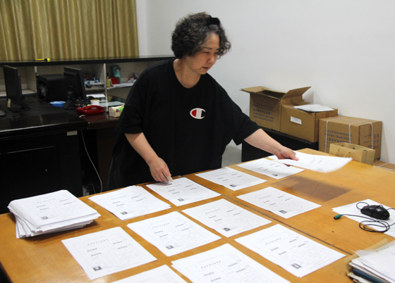 负责毕业证书和档案发放管理的张蕙老师,尽管明年就要退休了,但她始终把一名共产党员的责任扛在肩上。因为发证是最后一道关卡,要做的事很多,首先要逐个进行费用清算,和财务沟通,能发不能发的要逐一清点。自考学生毕业证,从考试院盖完章过来不是按站点排列的,需要重新清点验收,按站点分拣,重新编制发放花名册,她和部门同事们全部一起流水作业,都要耗时费力一星期以上。她还要核实领取人身份,记录身份证号,要签字留底,最后报祝艳芳老师上网。她还要负责补办毕业证明书和档案以及其他学籍学历证明等额外工作。由于成教毕业证书贴照片、毕业生档案制作和密封工作时间紧,她也要经常一起加班协助。