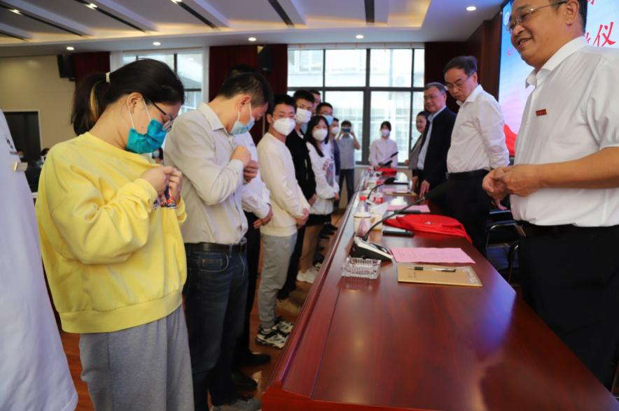 谈传生和杨华峰、邹兴平、刘英姿等领导,给现场学员佩戴了校徽。
