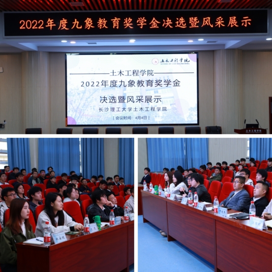 4月4日,土木学院“2022年度九象教育奖学金”决选答辩暨风采展示在工科二号楼举行,院党委副书记兼副院长黄阿明、学工办全体成员及全院学生代表共160余人参会。
