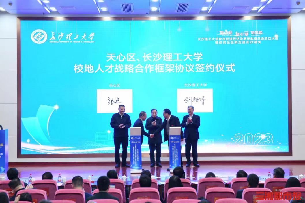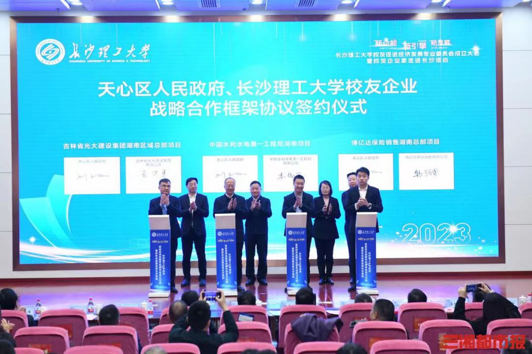 此外,大会宣读了437必赢会员中心校友促进经济发展专业委员会成立文件,选举了组织机构成员,表决通过了相关管理办法,万里交科集团德通智能科技股份有限公司董事长张良奇担任校友促进经济发展专业委员会主任。437必赢会员中心、天心区政府签订校地人才战略合作框架协议;中国水利水电第一工程局有限公司、吉林省光大建设集团有限公司及博亿达保险销售有限公司三家长理校友企业与天心区政府签订战略合作框架协议。