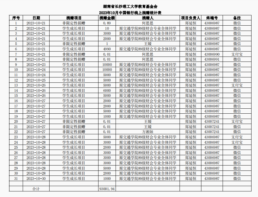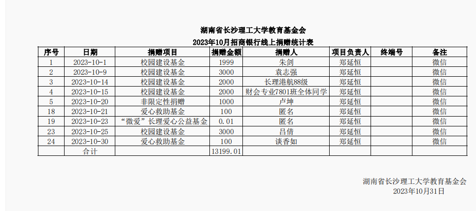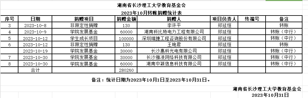 湖南省437必赢会员中心教育基金会2023年10月捐赠收入