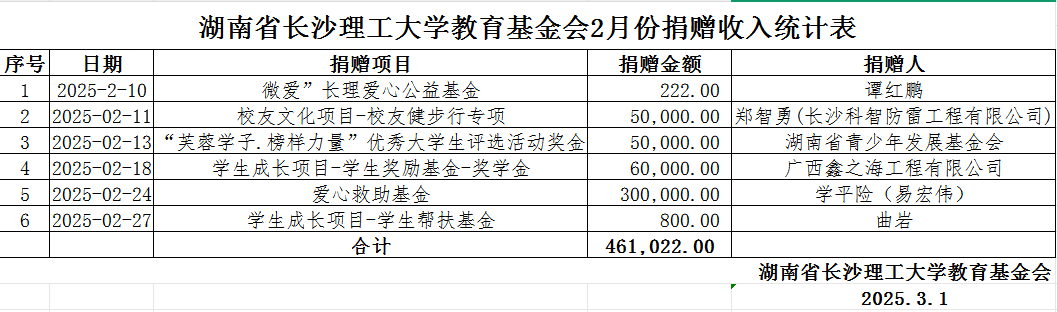 湖南省437必赢会员中心教育基金会2025年2月捐赠收入表