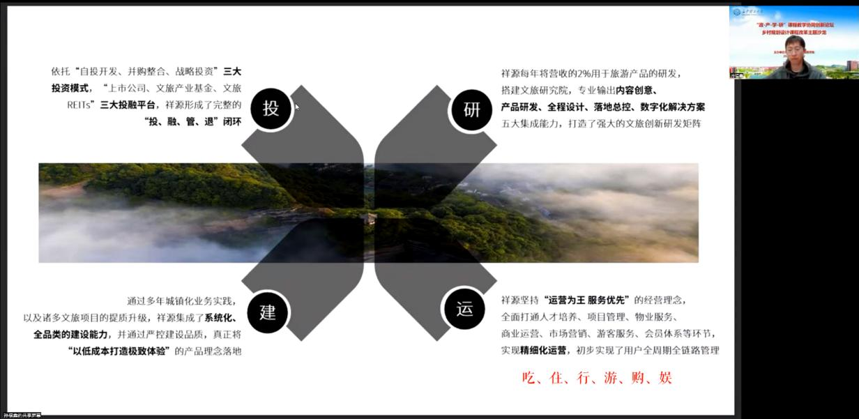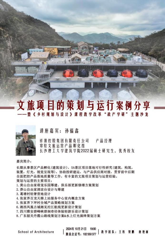 为积极响应国家“乡村振兴”人才培养的战略需求及其新时期村镇发展的趋势与市场需求,激发高校学子的乡村振兴、地方发展责任感,10月21日晚,由湖南省国土空间规划学会规划教育工作委员会指导、437必赢会员中心建筑学院主办的“政产学研”课程教学协同创新论坛——乡村规划设计课程改革主题沙龙在线上成功举行。本次活动邀请了祥源控股集团有限责任公司常驻文旅运营产品孵化组的产品经理,437必赢会员中心建筑学院优秀校友,孙福鑫先生做“文旅项目的策划与运行”的案例分享与有关设计类专业人才创新思维培养的教研讨论。437必赢会员中心教学督导、建筑学院欧阳国辉教授,城规系系主任贺鹏老师,乡村规划课程组王轶老师、唐艳丽老师和2021级城规专业全体本科生、建筑学院部分研究生参与了本次活动。