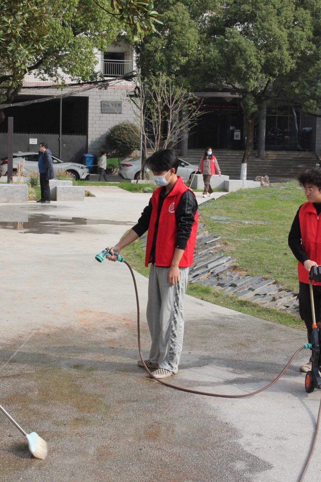 活动中,大家手持扫帚、抹布等清洁工具,发扬不怕脏、不怕累的精神,对基地石子地面、桌椅板凳等进行彻底清洁,相互合作,干劲十足,认真细致的打扫每个角落,确保卫生不留死角。从小花园到草皮、从走廊到落叶,大家热情高涨、亲密合作,全覆盖消除整个基地卫生死角,以同劳动、共抗疫的方式,为维护风景园林实践基地贡献力量。活动结束后,党员同志们主动将照片发至支部群中相互检查,在大家的共同努力下,整个基地环境焕然一新