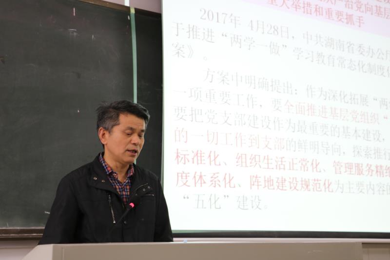 随后,学院特邀党建组织员毛光华主讲了题为《以〈中国共产党支部工作条例〉为基本遵循,全面推进基层党组织“五化”建设》的党课。他从《中国共产党支部工作条例(试行)》主要内容、基层党组织建设的重要性和意义、基层党组织“五化”建设的总体要求以及目标任务与标准要求等四个方面进行了阐述和解读。
