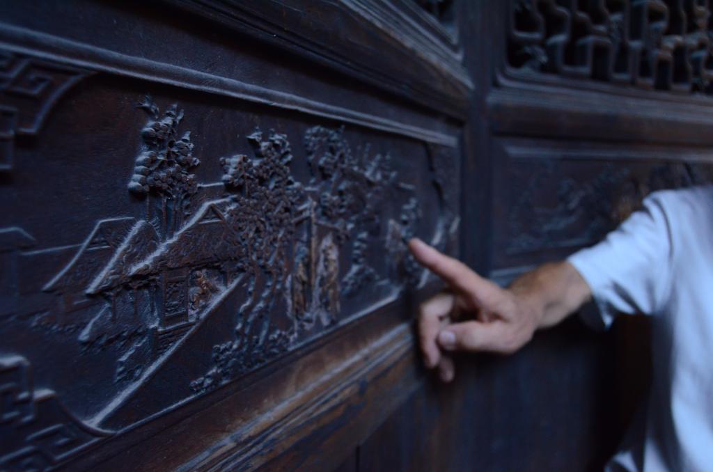 实践团通过事先资料调查,了解到老街是古时佛堂的商业中心。经调查发现老街仍旧保持着楼下商铺、楼上住宅的格局。木质的建筑、商铺内现代化设备,侧面展现了民居内人们的生活状态。实践团针对单个民居进行了实地测量,直观了解老街民居。紧接着,实践团来到佛堂吴宅,对吴宅结构、尺度、细部等方面进行测量记录。吴宅是义乌现存唯一一幢砖木结构三层半高的老楼房,其内各色木雕细致精美、钟灵毓秀,富有美好寓意与文化内涵。调查期间,实践团有幸得到了吴宅内一位老伯的热情讲解,明白了雕刻内容所承载的典故、寓意,更加理解佛堂当地木雕文化与古建的结合。