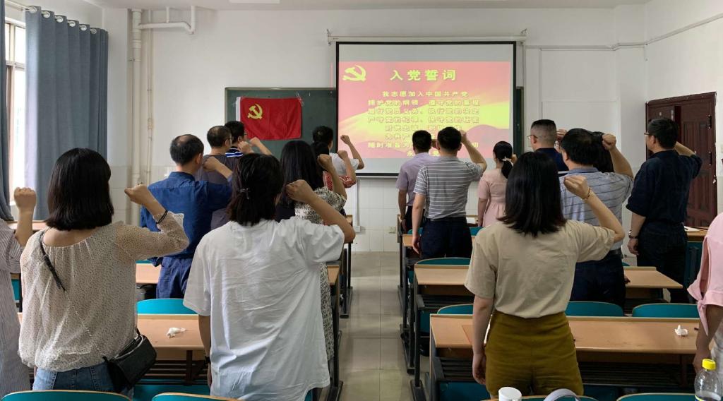 最后,全体党员同志面对鲜红的党旗,庄严举起右手,重温入党誓词。