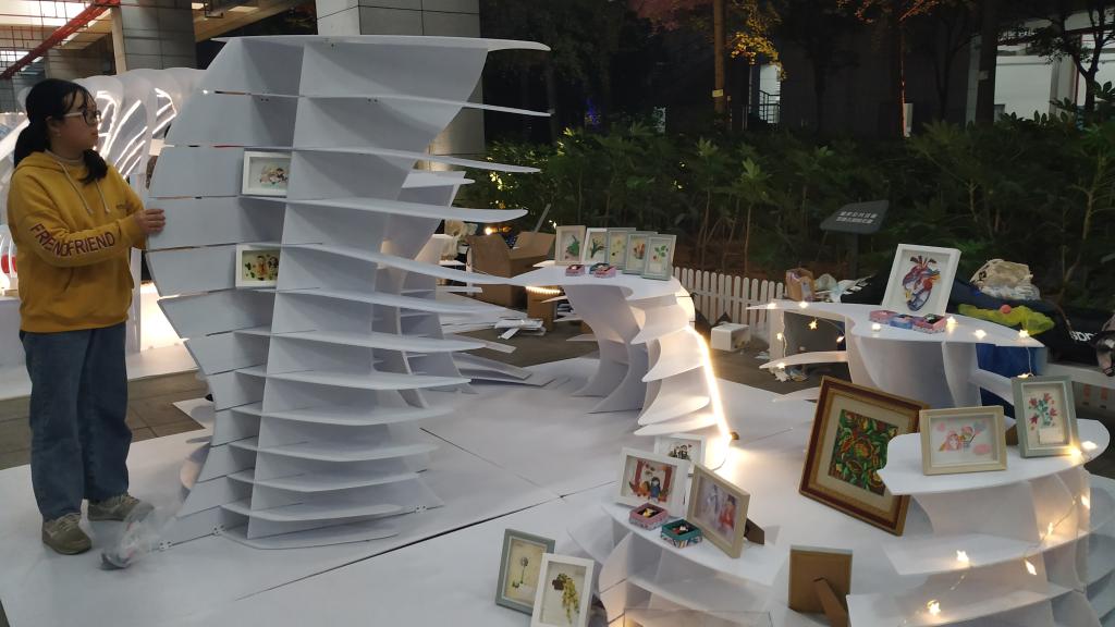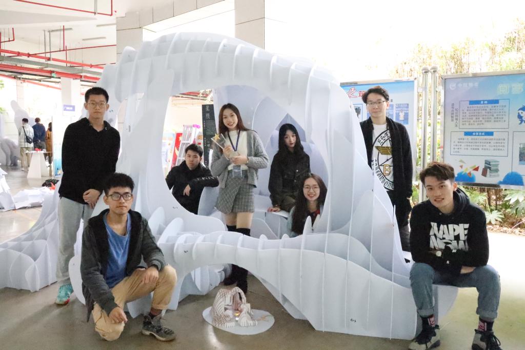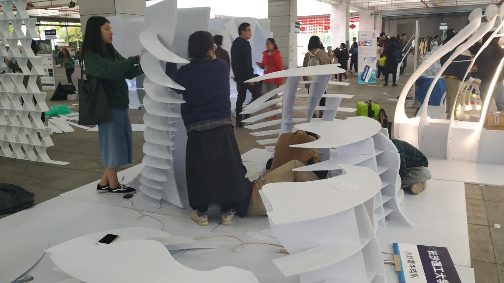 我院参赛的两支队伍及作品分别是“专注磕糖的范德逻”队建造的《星陨》和“小炒黄牛肉”队建造的《炊烟》,16名队员在周迪、何川、胡颖荭等老师的指导下,通过院内选拔、持续改进、修改完善,经过二十多个昼夜的奋战准备后,在长沙规划展示馆用近10个小时的时间,建造了两个丰富、灵动、多样的创意空间,获得了现场观众、评委及网络的广泛好评,其中《星陨》脱颖而出,获得二等奖。
