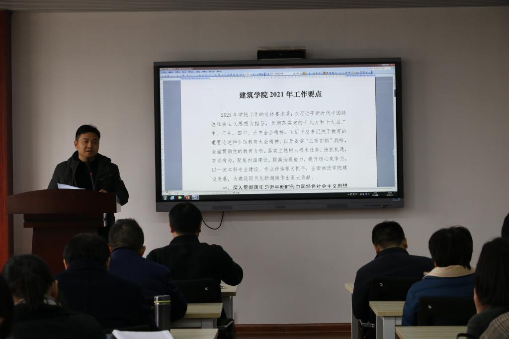 副院长熊鹰结合工作要点,解读了2021年建筑学院工作要点:深入贯彻落实习近平新时代中国特色社会主义思想,加大人才引进力度,提高教师博士化程度,对标对标建设学科专业,紧锣密鼓备战建筑学专业评估工作,加强建筑学专业国家一流专业建设,加强省级平台建设,力争2021年国家级专项、横向实践项目上一个新台阶,加强学院内部治理,服务学生发展,落实立德树人根本任务。
