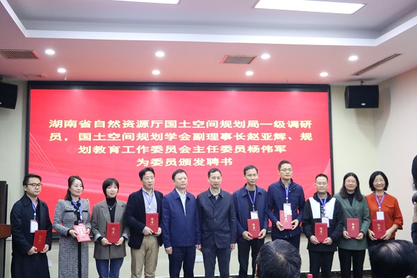 湖南省国土空间规划学会副秘书长杨春宣读了《关于学会2021年增设专业(工作)委员会组成人员的通告》。大会分别为教工委主任委员、副主任委员、委员颁发聘书,委员单位包括高等院校、科研院所、规划设计院、企业等。