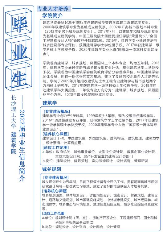 目前建筑学院 2022届毕业本科生共有 98 人,其中建筑学专业 72 人,城乡规划专业 26 人。毕业研究生共有 33人,其中建筑学方向19 人,城乡规划方向 14 人(毕业生信息详见《附件一》)。为使我院毕业生与用人单位达成良好的沟通,配合贵单位做好 2022届毕业生接收工作,我院兹定于 2022 年 3月 15日——4月 25日举办437必赢会员中心建筑学院 2022年春季招聘会。诚挚邀请贵单位光临指导!