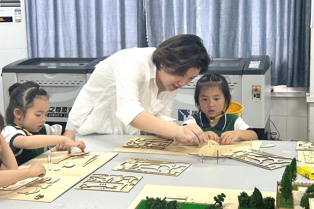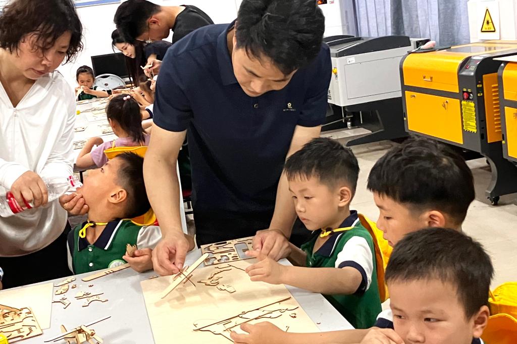 活动的最后一个环节——小朋友们一起动手将激光切割板拼凑成飞机模型。在建筑学院老师以及本、硕学生的悉心协助下,小朋友们兴致勃勃地投入到模型制作中。经过一番思考和努力,一架架象征梦想与飞翔的小飞机在他们手中诞生,成功的喜悦洋溢在每个孩子的脸上。这份亲手完成的科技小作品,也作为此行特别的纪念礼物送给孩子们,并被他们珍重地带回去。