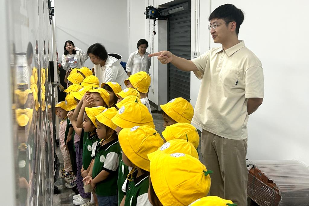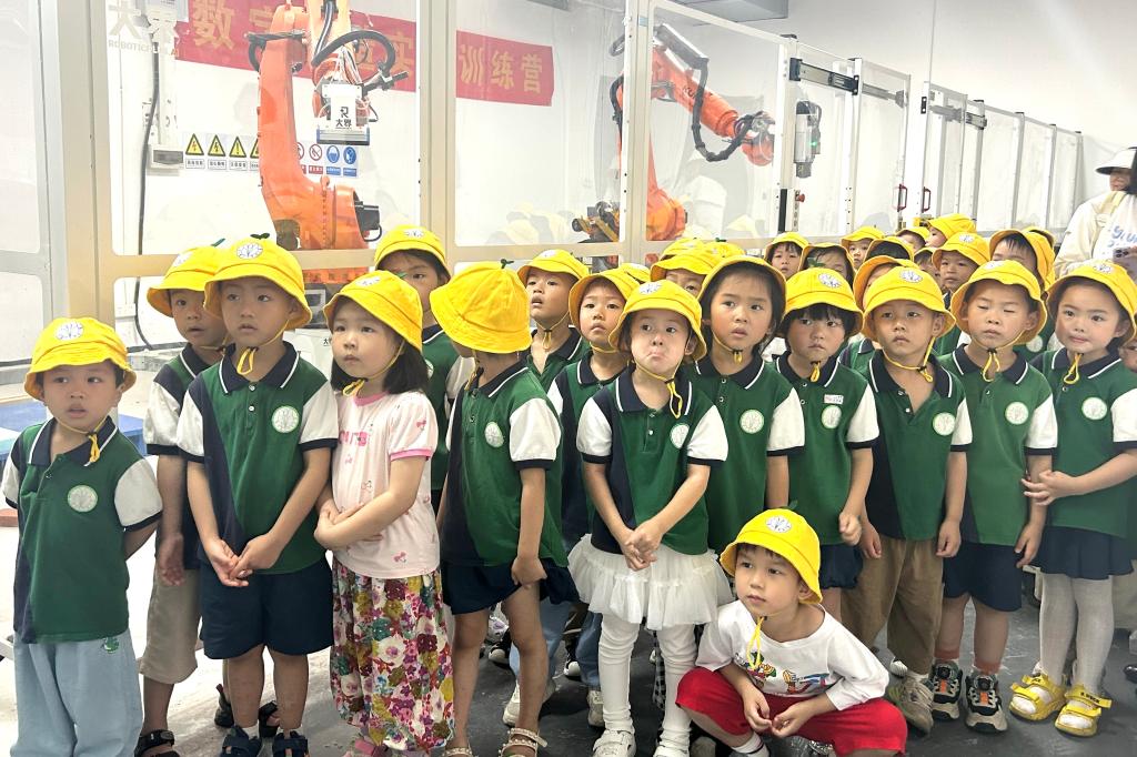 活动首站聚焦前沿建造技术。在学院智慧设计-建造体验营的核心场地——数字建造实践中心,实验中心副主任马成也老师化身 “科普讲解员”,以生动语言为孩子们打开科技之窗。小朋友们不仅观看了精彩的科普短片,更近距离惊叹于机器臂在程序指挥下精准、灵活地操作砖块进行“机器人砌筑”,数字建造技术的神奇力量清晰展现在他们眼前。马成也老师的耐心讲解,用通俗易懂的语言让孩子们初步认知了这些先进的科技成果,化抽象科技为具象感知,让未来智能建造的种子在孩子们心中悄然萌芽。