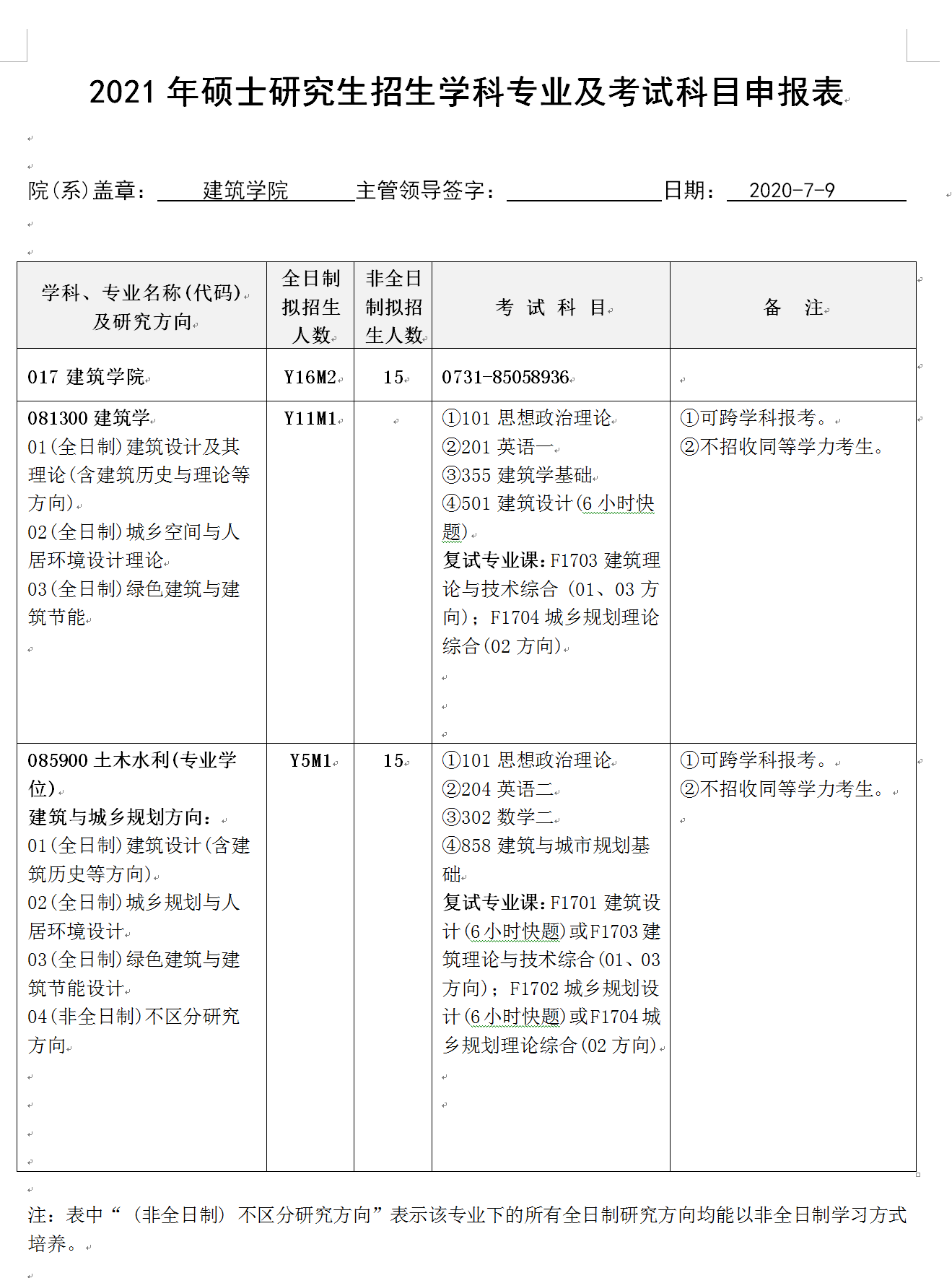 请点击《2021年硕士研究生招生学科专业及考试科目申报表》附件下载:咨询电话:0731—85058936