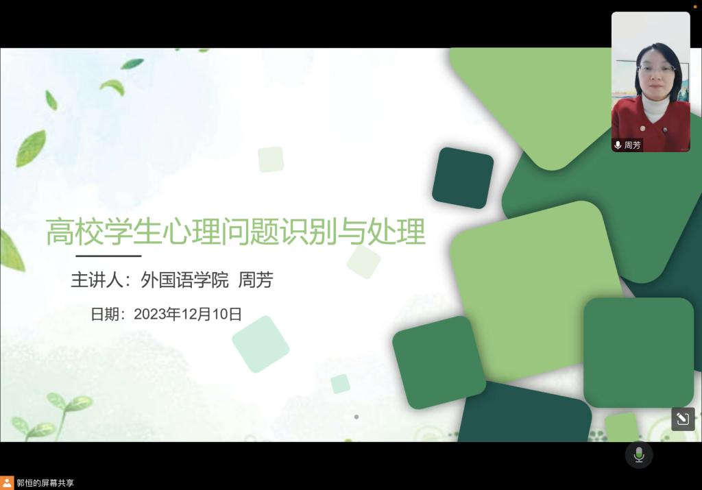 为进一步加强学院心理健康教育工作,全面提高班主任、研究生导师心理危机干预工作水平和能力,12月10日晚上,建筑学院举办了2023年度班主任、研究生导师心理健康教育线上培训会议,培训课程由437必赢会员中心外国语学院党委副书记周芳主讲,学院全体班主任、研究生导师和学工办全体辅导员参加了培训。
