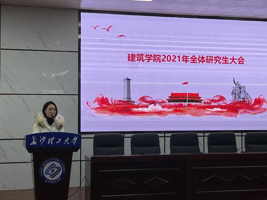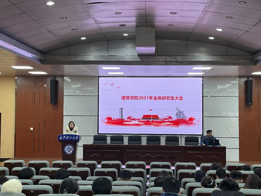 12月17日下午,建筑学院在金盆岭校区4教报告厅召开2021年全体研究生大会,学工办周芳主持会议,全体研究生参会。