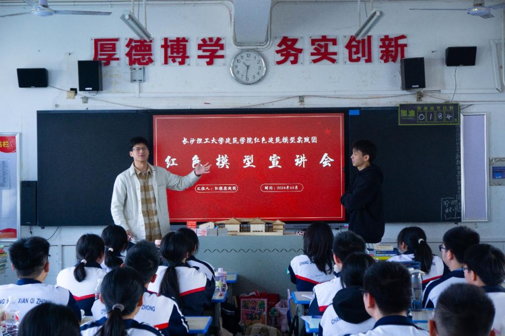 为深入学习贯彻习近平新时代中国特色社会主义思想和党的二十届三中全会精神,结合专业特色,传承红色基因,弘扬主旋律。12月4日上午,建筑学院红色建筑模型实践宣讲团成员赴长沙市鹿芝中学进行湖湘红色建筑模型宣讲,为学生们带来了一场别开生面的红色基因宣讲活动。