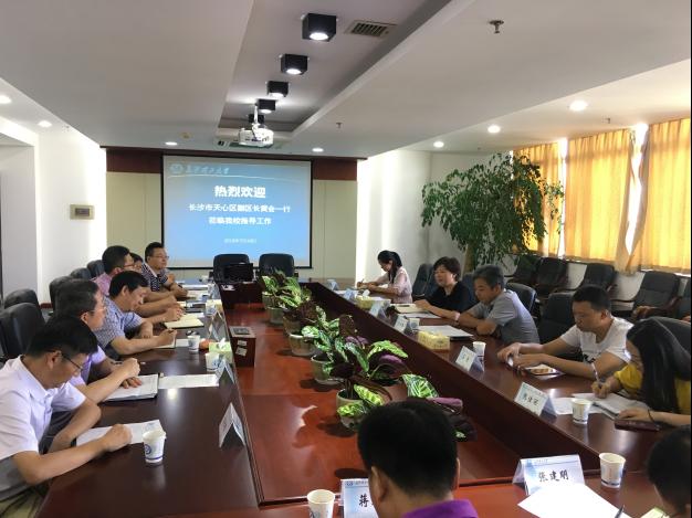 7月19日上午,长沙市天心区副区长黄会、区政协副主席彭泽南、区科技局副局长苏奇、许品方等一行来必赢官网调研。会前,校党委副书记邹宏如会见了黄会一行。座谈会在云塘校区一办公楼五楼会议室召开。副校长杨伟军,科研部、人文社科处主要负责人以及相关学院副院长出席了座谈会,会议由科研部副部长王建辉主持。