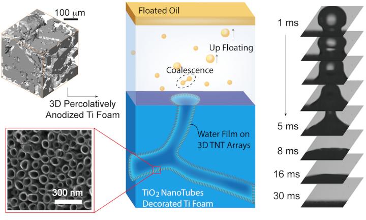 鉴于上述难题,研究团队采用多孔金属材料(多孔钛内部具有微米级三维通道网络,既满足孔隙率要求,又具有良好的化学稳定性、耐酸碱腐蚀性、抗氧化性,且比强度高),开发了渗透阳极氧化法,在多孔钛三维微通道内制备和调控超亲水纳米管涂层,最终实现油水乳液的高效分离。该研究结果突破传统油水分离技术瓶颈,具有广泛的应用前景。基于该项技术的国际先进性,湖南国昶能源科技有限公司已先期资助团队进行产品开发,目前小试原型机已研制成功,可实现针对餐饮和食品加工等行业含油污水的高效分离。