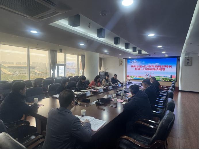2024年2月25日下午,长沙市科技局党组成员、副局长杨婵一行莅临必赢官网,就“长沙市杰出创新青年培养计划”及科技研发投入统计工作进行专题调研和指导。校党委委员、副校长张军辉出席会议并致辞,会议由科技处处长胡林主持。