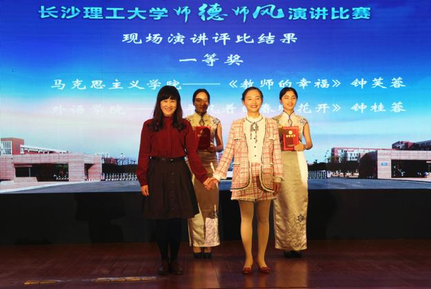 经过专家评审、大众评环节的角逐后,后勤集团子校李慧老师获现场演讲特等奖,马克思主义学院钟芙蓉、外语学院钟桂蓉获得一等奖,国际学院黄文卫、物电学院郭剑、交通学院韩伟威获得二等奖,数统学院王跃恒、经管学院张帆帆、土木学院贺佐杰、机关万馨获三等奖,其余10位选手获得优秀奖。比赛还设立了演讲稿创作奖及现场人气选手奖。与会领导嘉宾为获奖选手颁奖。
